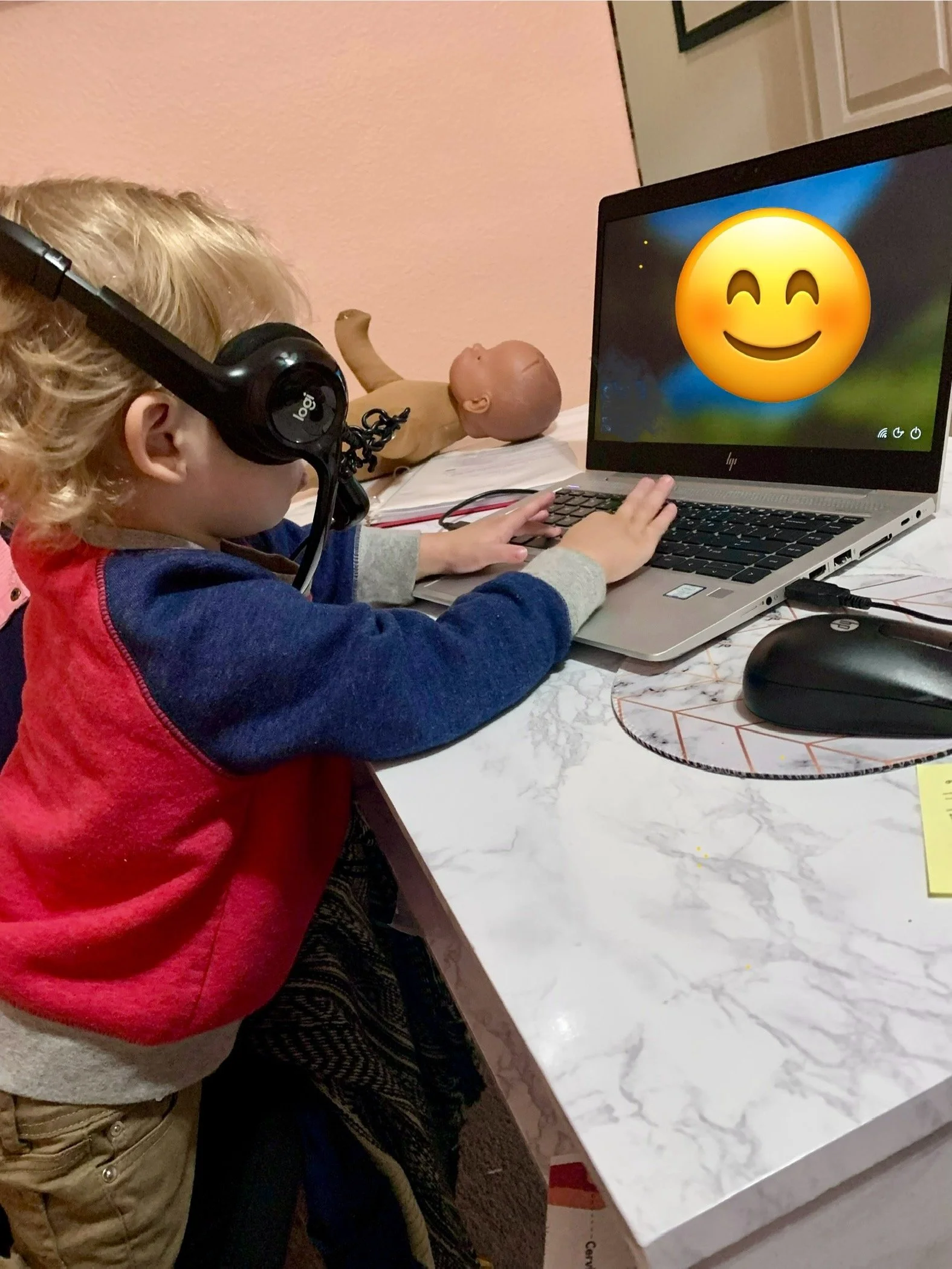 Child wearing headphones and glasses, sitting at a table, typing on a laptop with a smiling emoji on the screen. There is a doll and some papers on the table.